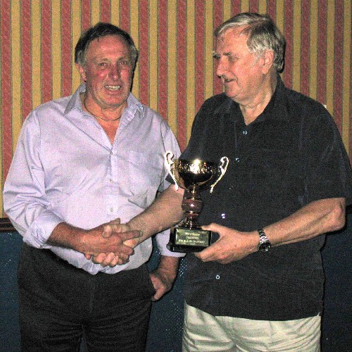 Lingard beat Downing by six points (232-226) in the first semi-final, Harvey overcame Gay by 307 to 267, Andress defeated Mitchell by 367-280 and Williams completed the semi-final line-up with a 322-237 win over Phillips. In his semi-final against Geoff Lingard, Matt Williams recorded a break of 121 which was enough to secure a narrow (333-301) victory despite a run of 117 by the Bude player. Brian Harvey won the second semi with a 312-282 win over Bill Andress. Harvey retained his title with a 321-238 win over Williams asserting his superiority only in the closing stages of what was largely a closely fought final. The Cup and a prize of £100 – kindly donated by Royal Cafes (Liskeard) Ltd – were presented by Mr. Alan Lovegrove, President of the Devon County Billiards and Snooker Association. Grateful thanks were expressed to the sponsors and to Rileys Club for the use of their facilities.